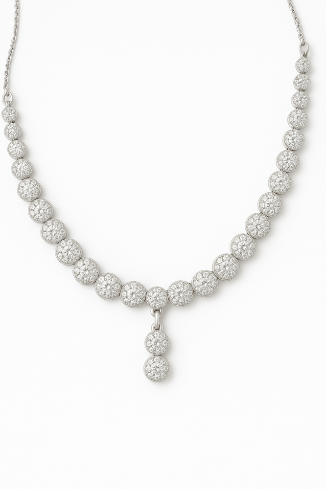 Stříbrný náhrdelník královský má zapínání na karabinu a je povrchově upraven rhodiováním. Rhodium patří mezi drahé kovy, patřící do skupiny platinových a chrání stříbro před černáním, zvyšuje lesk náhrdelníku. Kameny: čiré zirkony