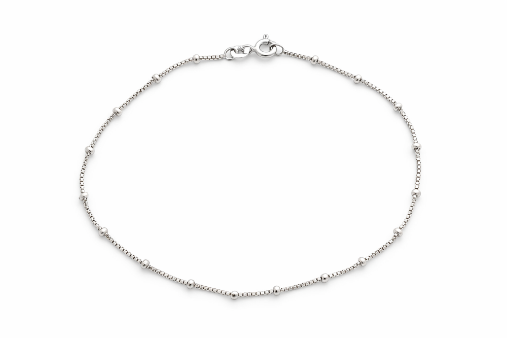 Precizně zpracovaný řetízek z ryzího stříbra 925/1000 je doplněn drobnými leštěnými kuličkami, které se při chůzi jemně lesknou a vytvářejí elegantní hru světla. Náramek je lehký, pohodlný a ideální jak pro letní dny naboso, tak i jako stylový detail k sandálům či podpatkům.