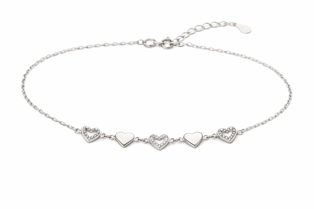 Jsou šperky, které mluví potichu – a přesto řeknou všechno. Tento stříbrný náramek na nohu se srdíčky a zirkony je oslavou jemné lásky, blízkosti a ženské něhy.