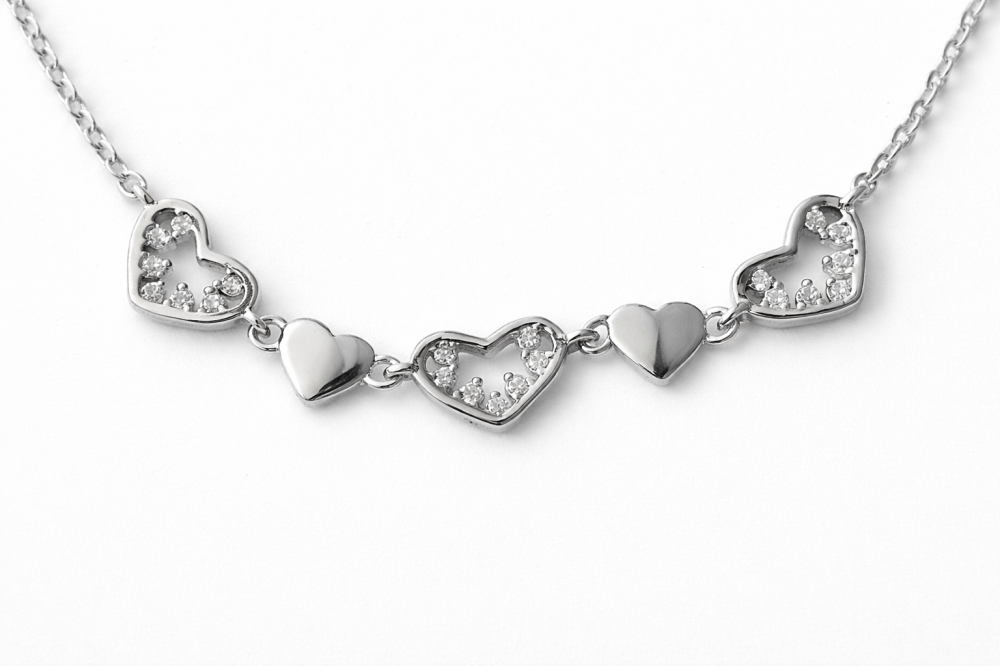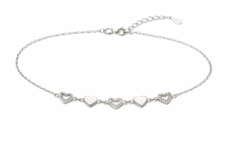 Střídání hladkých srdíček a srdcí zdobených zirkony vytváří harmonický rytmus, který působí lehce, elegantně a přirozeně. Zirkony dodávají šperku jemný třpyt, jen tolik výrazný, aby zachytil světlo při každém kroku.