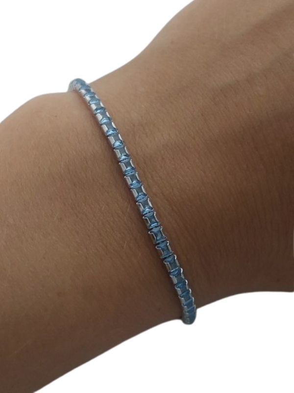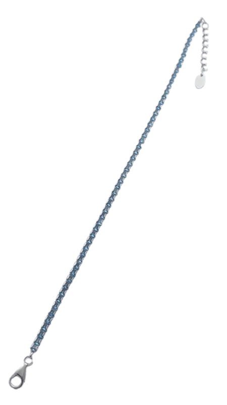 Tento elegantní náramek je vyroben ze stříbra ryzosti 925/1000 a zdoben jemnými modrými zirkony, které mu dodávají svěží, čistý a harmonický vzhled. Pečlivě broušené kamínky vytvářejí souvislou linii jemného třpytu, jenž se nádherně rozzáří při každém pohybu ruky.