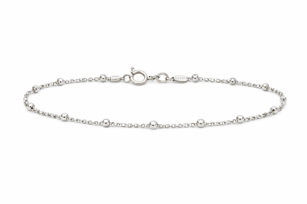 Náramek je vyroben ze stříbra ryzosti 925/1000 a tvořen tenkým řetízkem, který je v pravidelných rozestupech doplněn drobnými hladkými kuličkami. Ty jemně odrážejí světlo a dodávají šperku decentní strukturu bez rušivých detailů.