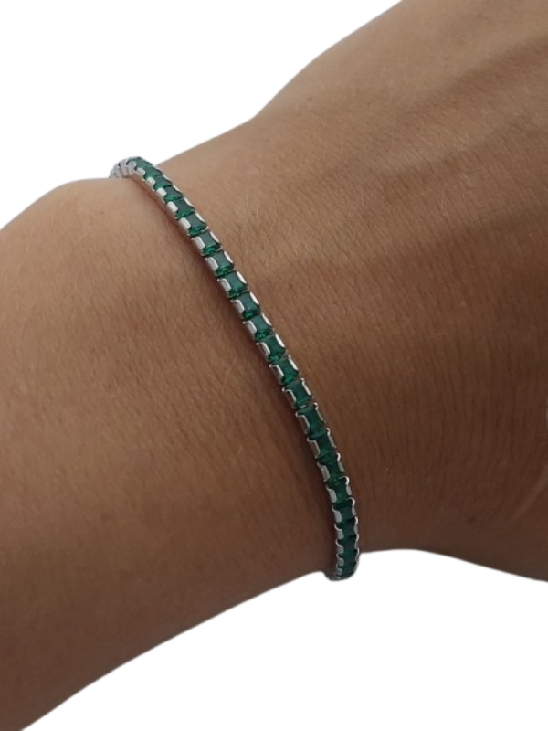 Tento jemný náramek ze stříbra ryzosti 925/1000 je zdoben sytě zelenými zirkony, které šperku dodávají výrazný, luxusní a zároveň elegantní vzhled. Precizně zasazené kamínky vytvářejí souvislou linii třpytu, jež se nádherně rozzáří při každém pohybu ruky.