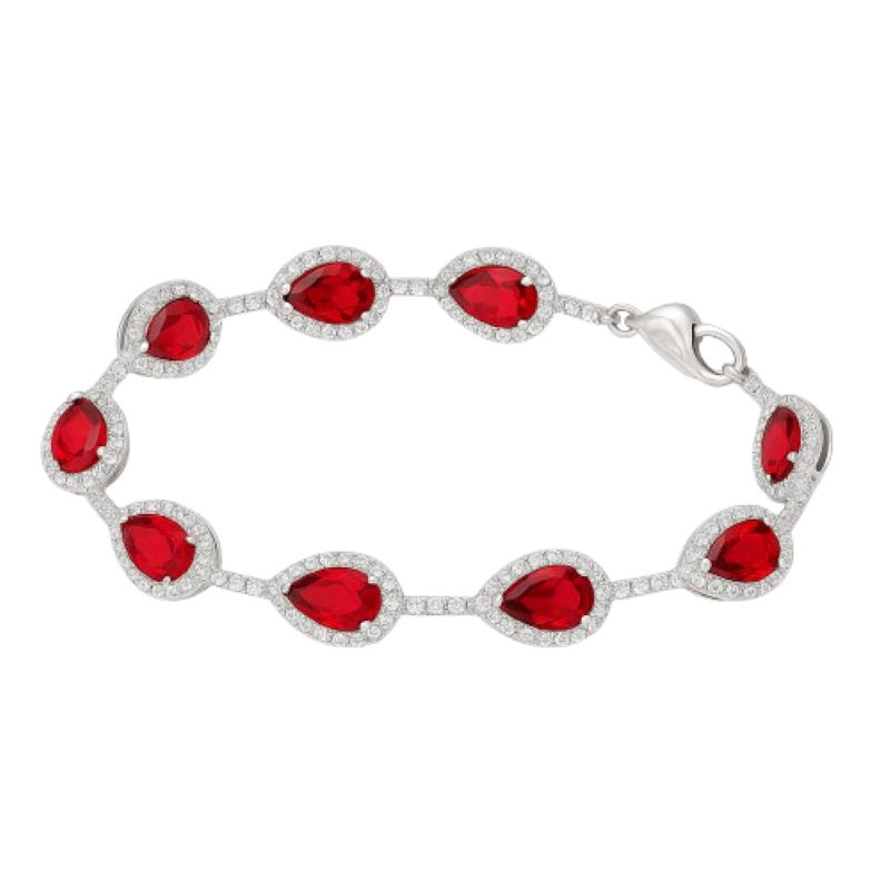 Tento luxusní stříbrný náramek je vyroben z kvalitního stříbra 925/1000, které zaručuje vysokou odolnost a dlouhou životnost šperku. Dominantou náramku jsou nádherné červené zirkony ve tvaru kapky, jejichž sytá barva působí elegantně, vášnivě a velmi žensky. Každý kámen je precizně zasazen a obklopen drobnými bílými zirkony, které dodávají šperku jemný a sofistikovaný třpyt.