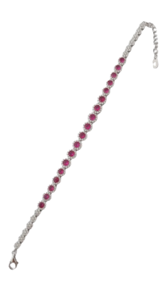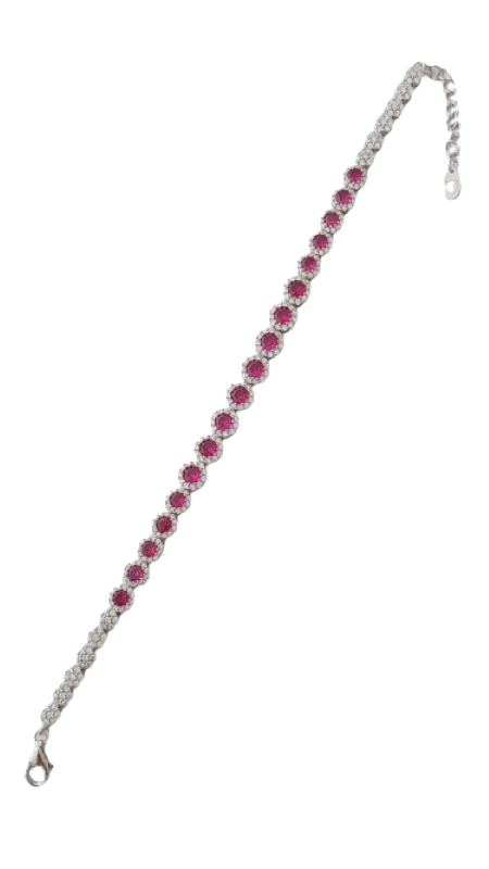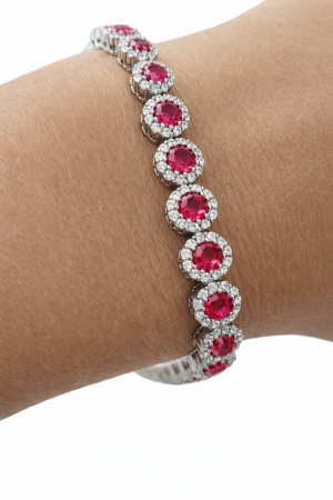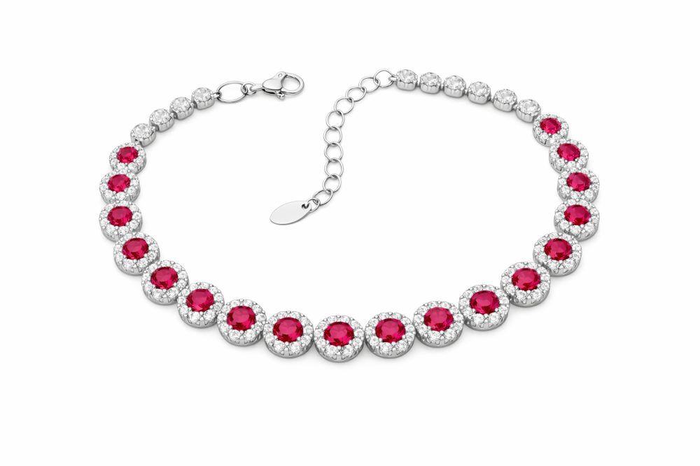 Tento výrazný a luxusně působící dámský náramek je vyroben ze stříbra ryzosti 925/1000 a zdoben nádhernými červenými zirkony, které okamžitě upoutají pozornost svým intenzivním barevným třpytem. Každý červený kámen je obklopen jemnou obrubou z drobných čirých zirkonů, které celému šperku dodávají hloubku, jas a exkluzivní vzhled.