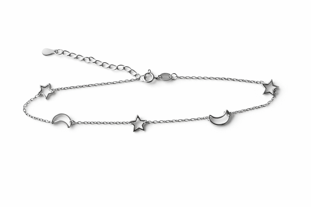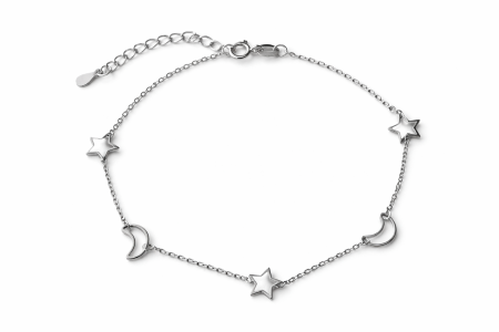 Objevte kouzlo noční oblohy v podobě jemného šperku. Tento stříbrný náramek na nohu s motivy hvězd a měsíce je vyroben z kvalitního stříbra ryzosti 925/1000 a zaujme svým lehkým, vzdušným designem.
