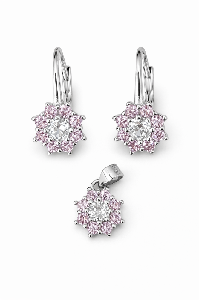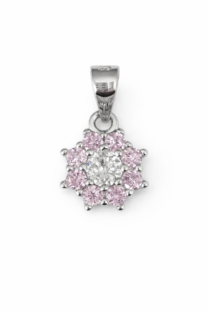 Jemný stříbrný přívěsek zdobený růžovými zirkony okouzlí svou harmonickou kompozicí a něžným třpytem. Centrální čirý zirkon je obklopen drobnými růžovými kameny, které vytvářejí květinový efekt a dodávají šperku romantický a ženský charakter.