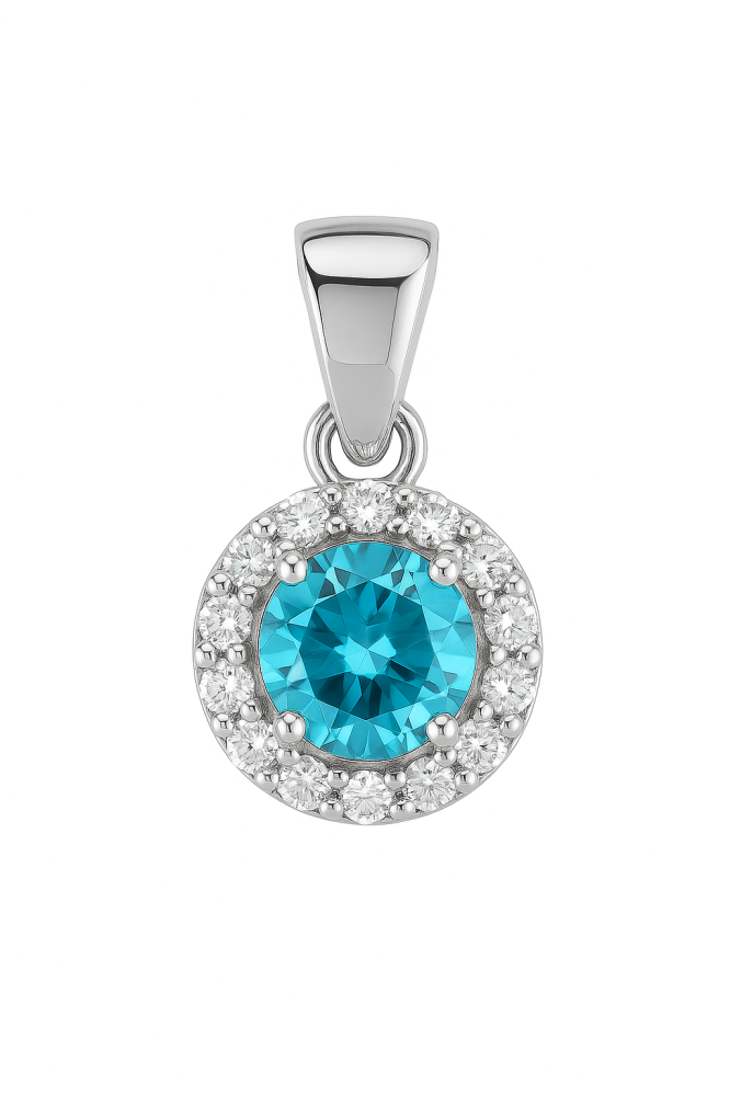 Stříbrný přívěsek s bleděmodrým zirkonem v halo designu. Rozměr přívěsku: 0.9 cm ( s očkem 1.5 cm ) x 0.9 cm Hmotnost přívěsku: 1.1 g