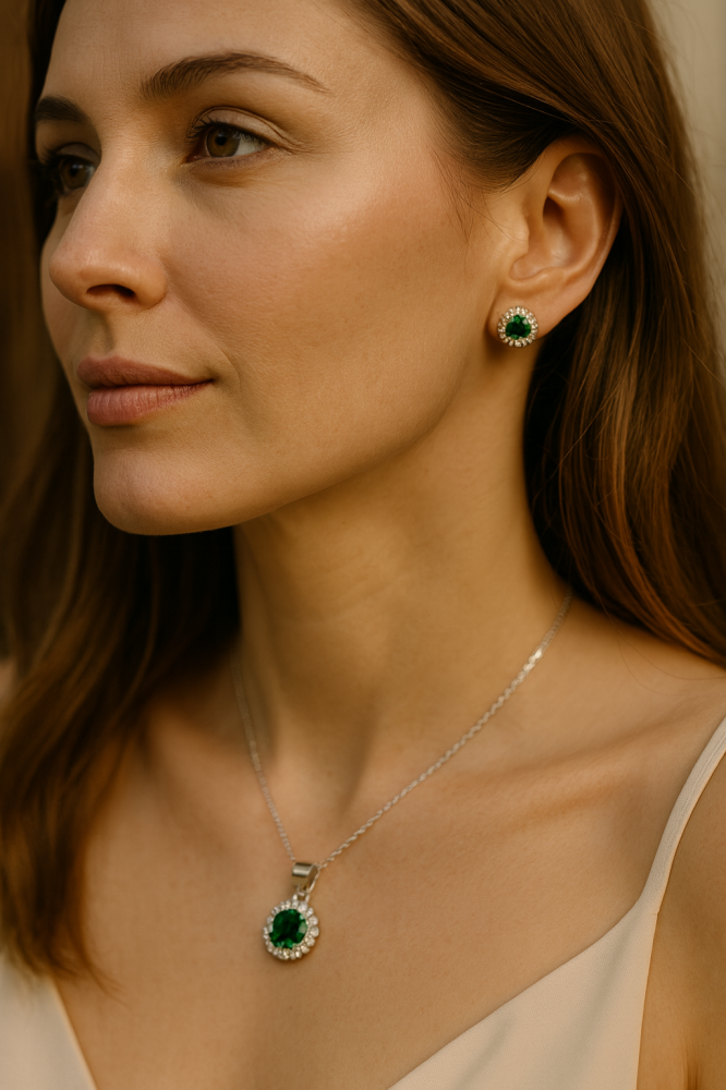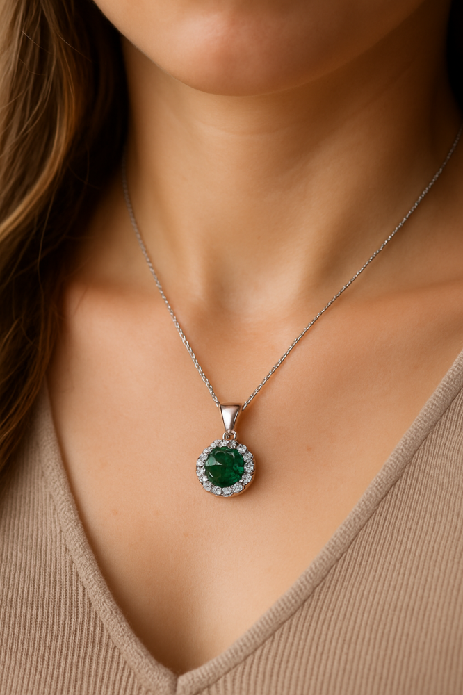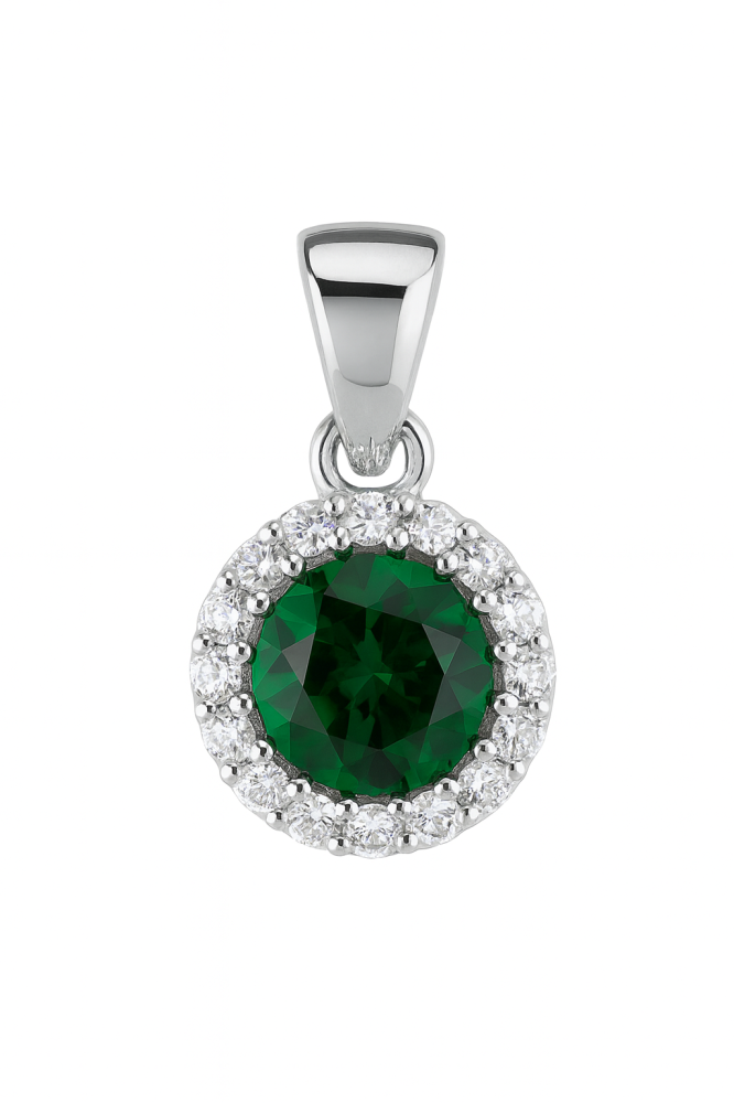 Dopřejte si šperk, který v sobě snoubí eleganci, nadčasovost a kvalitní zpracování. Tento stříbrný přívěsek z ryzího stříbra 925/1000 je osazen výrazným kulatým zeleným zirkonem, jehož hluboká barva okamžitě upoutá pozornost. Kolem centrálního kamene se jemně třpytí řada precizně zasazených čirých zirkonů, které přívěsku dodávají luxusní záři a opticky zvýrazní hlavní kámen.