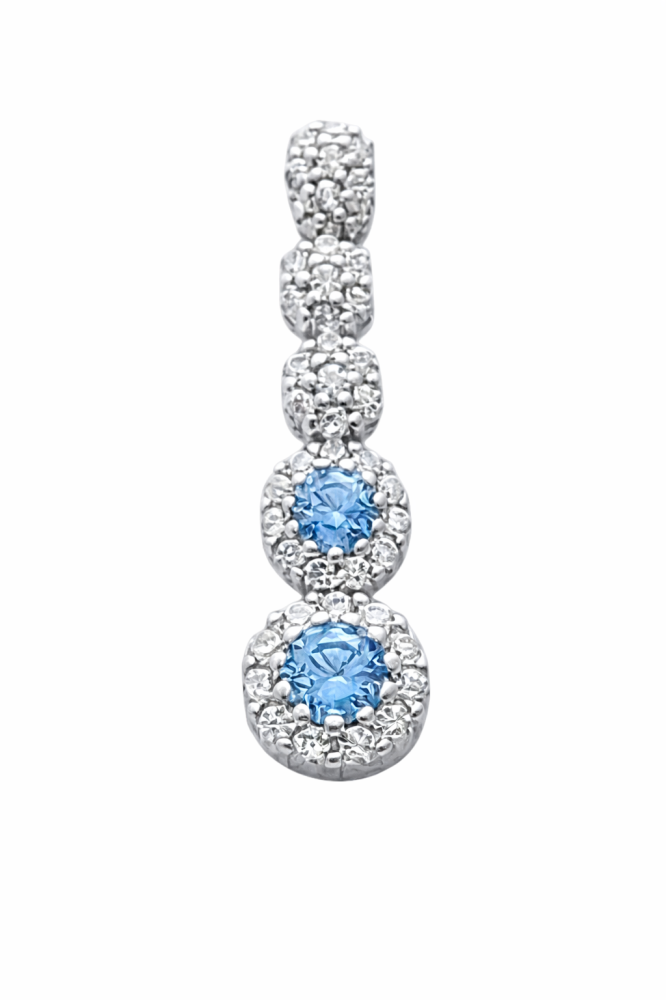 Vertikální linie přívěsku opticky prodlužuje dekolt a dodává šperku lehkost i sofistikovanost. Kombinace čirých a bleděmodrých zirkonů vytváří harmonický kontrast, který podtrhuje královský charakter šperku.