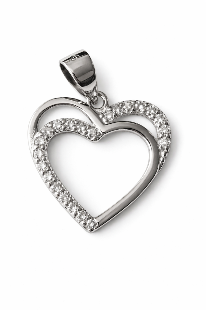 Jedna linie srdce je osazena čirými zirkony, jež dodávají šperku decentní třpyt a luxusní nádech. Kombinace hladkého lesklého stříbra a jemných kamenů vytváří vyvážený design, který se hodí jak pro každodenní nošení, tak pro slavnostnější příležitosti. Tento přívěsek je ideální jako romantický dárek i jako osobní symbol lásky.