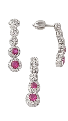Design přívěsku je tvořen vertikální linií článků – tři horní články jsou osazeny čirými zirkony, dva spodní dominantní články zdobí červené zirkony lemované jemným třpytem čirých kamenů. Tato kompozice opticky prodlužuje linii krku a působí velmi sofistikovaně.