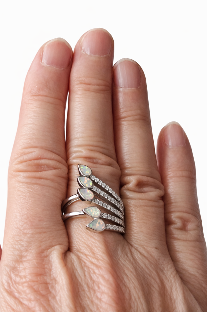 Tento stříbrný prsten s bílým opálem je ztělesněním jemného luxusu a ženské energie. Víceřadé provedení vytváří bohatý, ale stále elegantní efekt, který opticky prodlužuje prsty a působí velmi sofistikovaně.