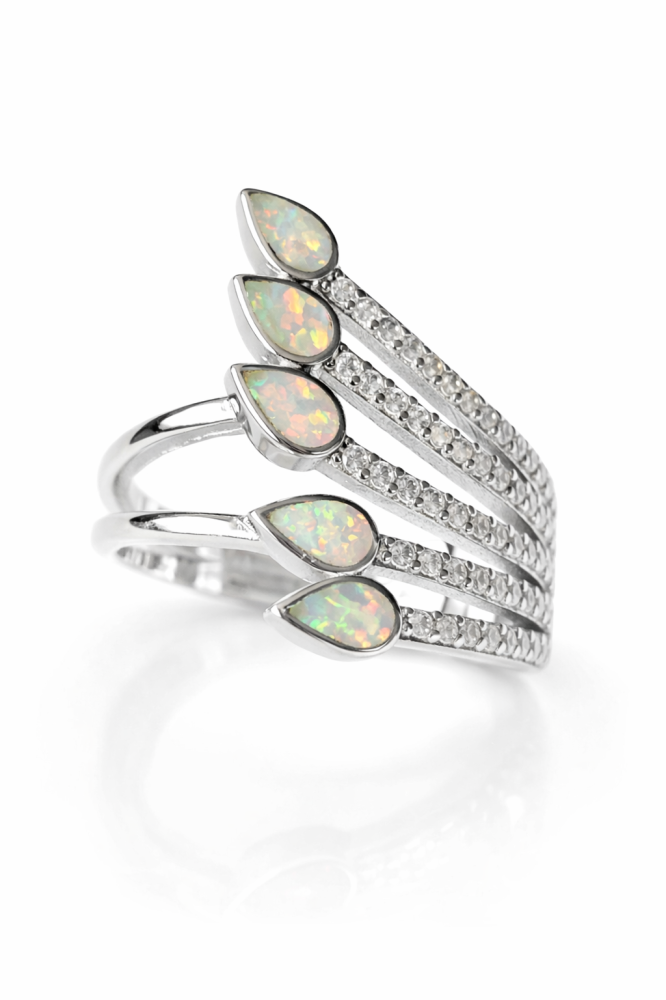 Bílé opály okouzlují svou duhovou hrou barev – od jemných zelených a žlutých záblesků až po teplé oranžové odlesky. Každý kámen je originál, a proto je i každý prsten jedinečný. Lesk zirkonů dodává šperku luxusní jiskru a dokonale podtrhuje třpyt opálů.