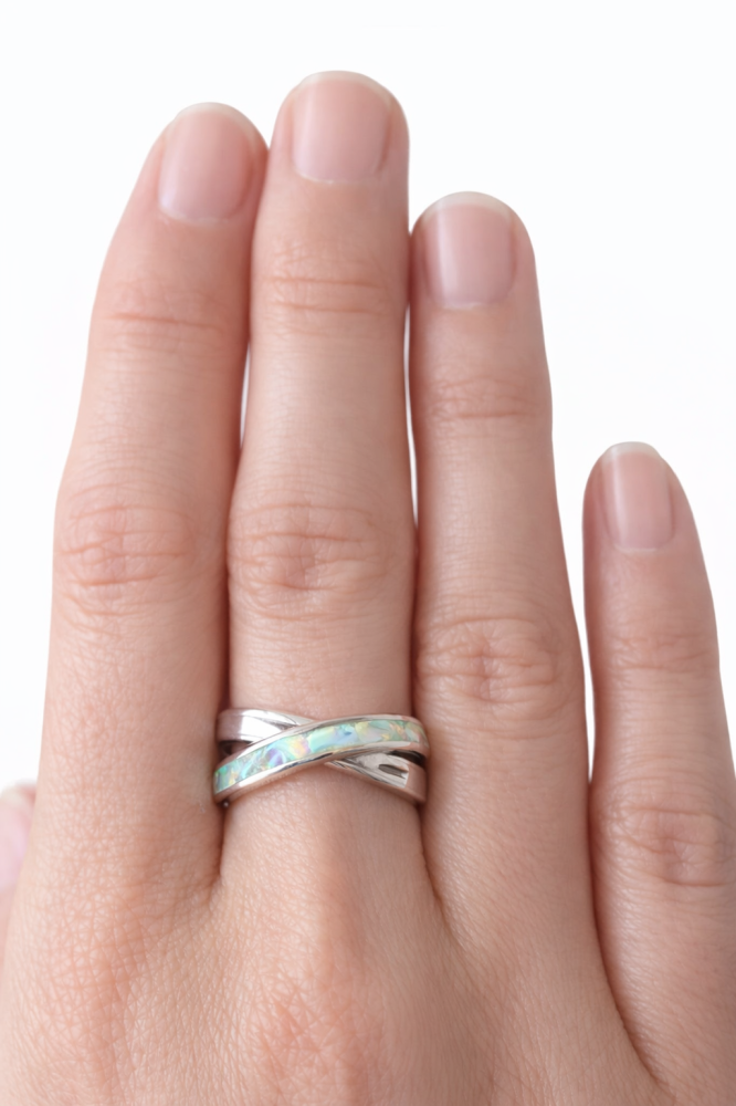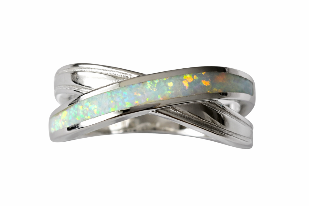 Tento elegantní prsten ze stříbra ryzosti 925/1000 zaujme jemně propleteným designem, který symbolizuje spojení, rovnováhu a nekonečno. Dominantním prvkem je pás bílého opálu s okouzlující duhovou hrou barev – od jemných zelených odlesků až po teplé zlatavé záblesky.