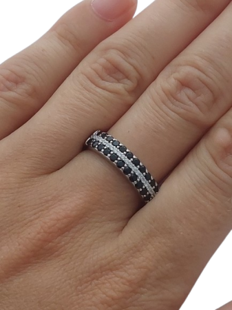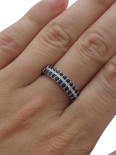 Prsten je vyroben z kvalitního stříbra ryzosti 925/1000, známého svou dlouhou životností a pohodlným nošením. Kombinace černých a čirých zirkonů dodává šperku sofistikovaný kontrast — světlé kameny zvýrazňují lesk, zatímco tmavé zirkony přinášejí moderní a elegantní charakter.