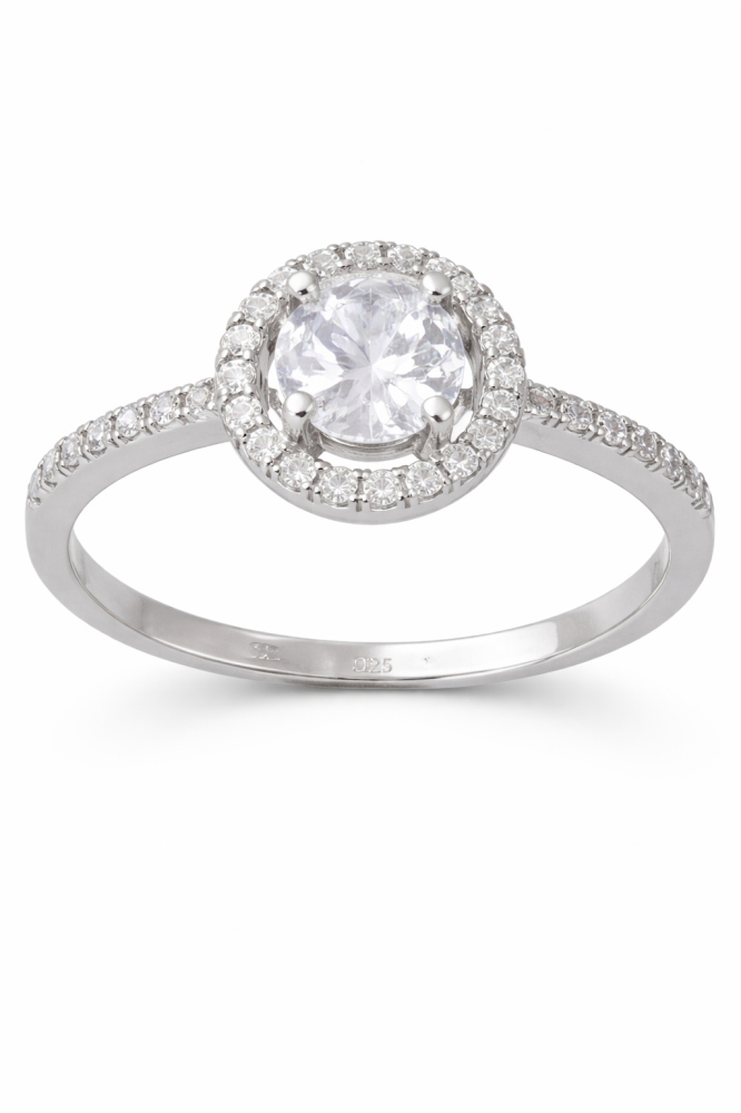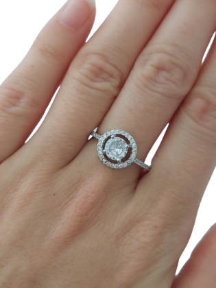 Dominantní centrální kulatý zirkon je zasazen do jemné halo obruby z drobných třpytivých kamenů. Tento design zesiluje odraz světla a vytváří efekt diamantového lesku. Každý pohyb ruky tak rozzáří prsten nádherným třpytem.