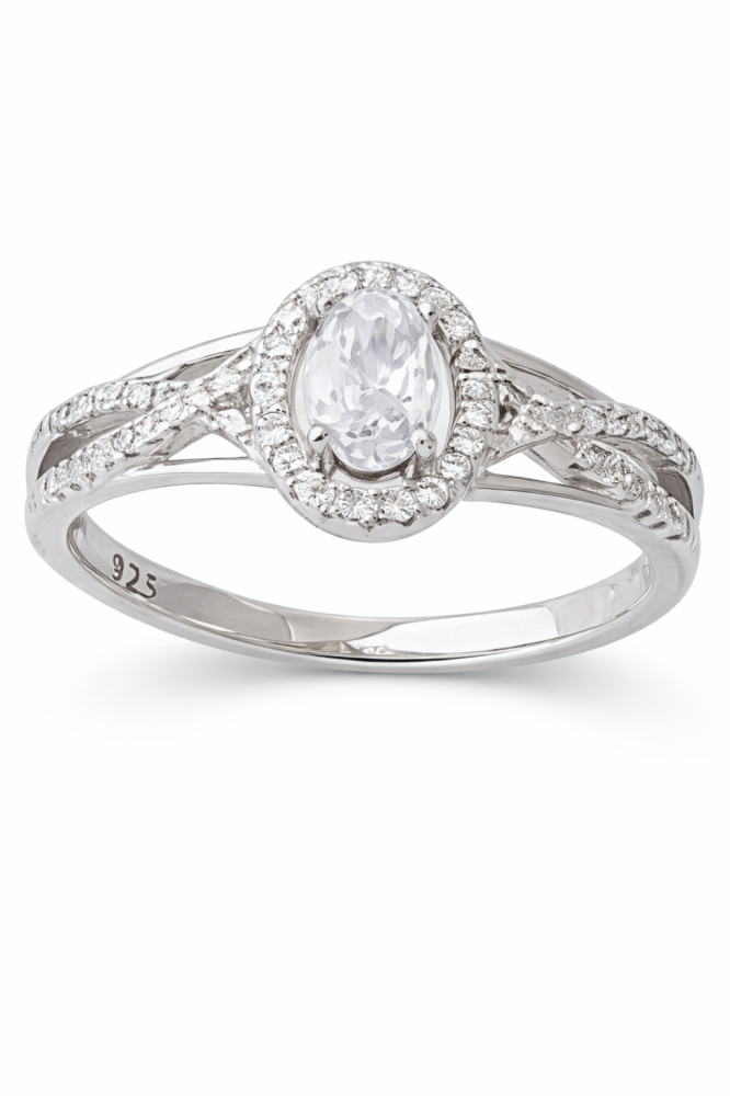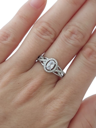 Dominantní oválný zirkon je obklopen jemnou třpytivou halo obrubou drobných kamenů, které zachycují světlo ze všech úhlů. Výsledkem je luxusní třpyt připomínající pravé diamanty. Jemně zdobené rameno prstenu dodává celému designu romantický a sofistikovaný charakter.