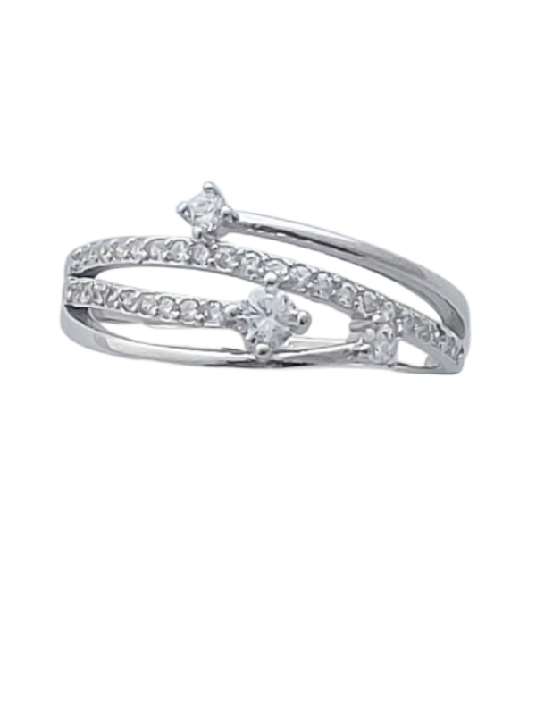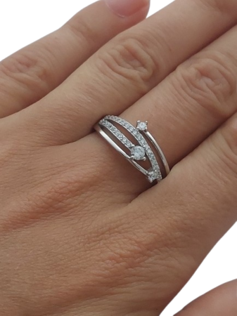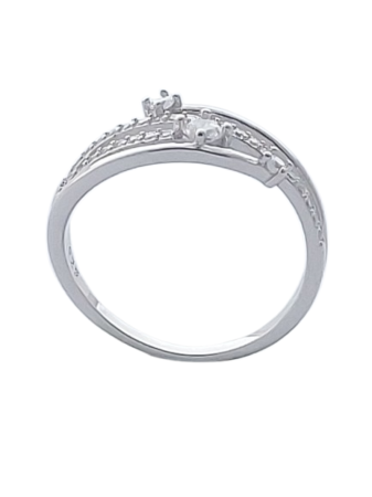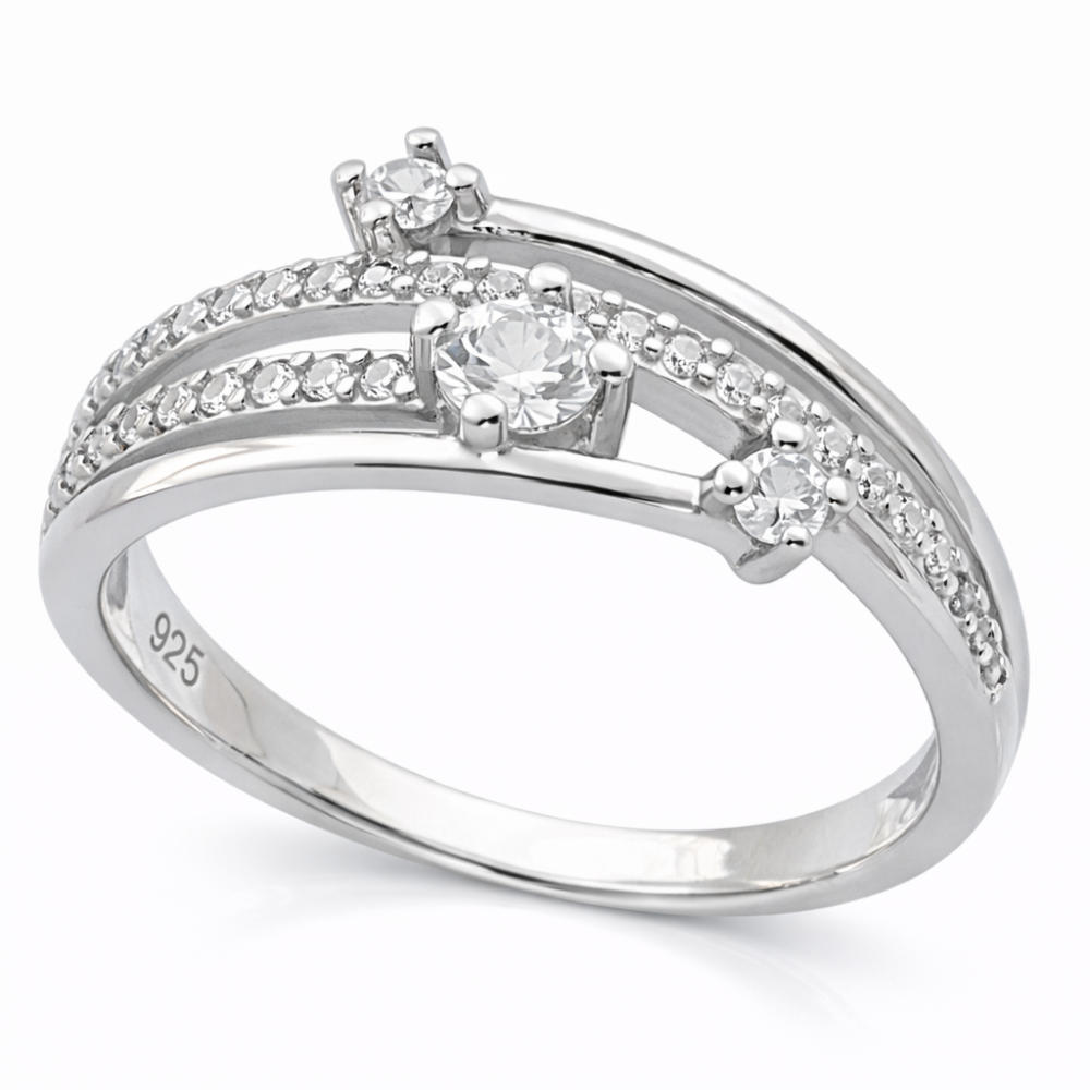 Tento stříbrný prsten se zirkony zaujme romantickým trojitým designem, který patří mezi nejoblíbenější styly dámských šperků. Tři dominantní čiré zirkony doplněné jemnou linií drobných kamenů vytvářejí harmonický a elegantní celek s luxusním třpytem.