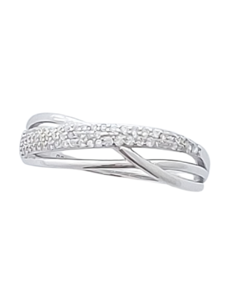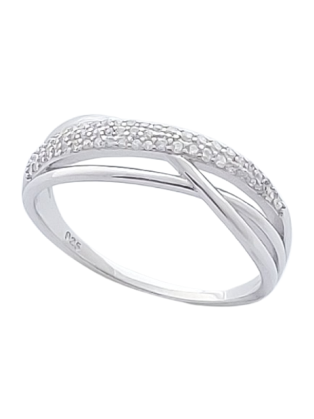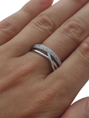 Tento stříbrný prsten s čirými zirkony zaujme propracovaným kříženým liniovým designem, který vytváří jemný efekt pohybu a elegance. Linie osazená třpytivými zirkony krásně zachycuje světlo a dodává prstenu luxusní třpyt připomínající diamantové šperky.