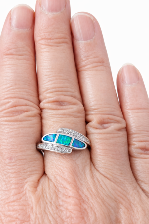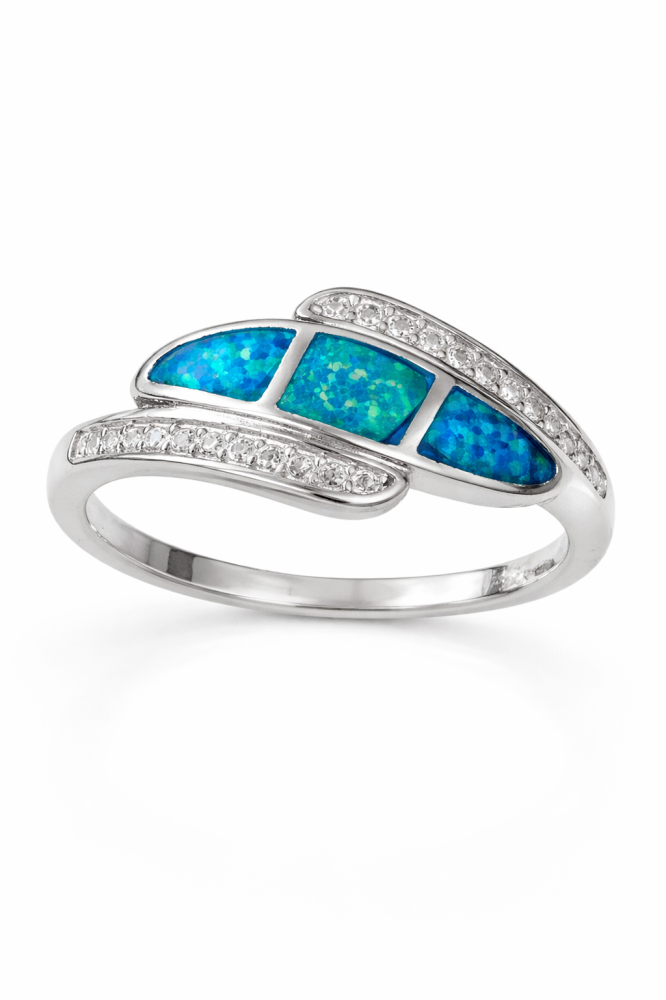 Tento stříbrný prsten s modrým opálem zaujme na první pohled svou intenzivní hrou barev. Opálová mozaika v odstínech tyrkysové, modré a smaragdově zelené vytváří efekt hluboké oceánské hladiny, která se mění s každým pohybem ruky.
