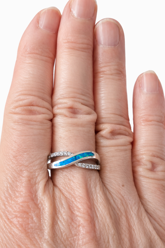 Stříbrný prsten s modrým opálem zaujme na první pohled svou elegantní proplétanou linií, která symbolizuje harmonii a nekonečné spojení. Dominantou šperku je sytě modrý opál s výraznou hrou tyrkysových a smaragdových odlesků, připomínající hladinu oceánu zalitou sluncem.