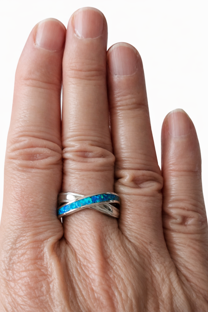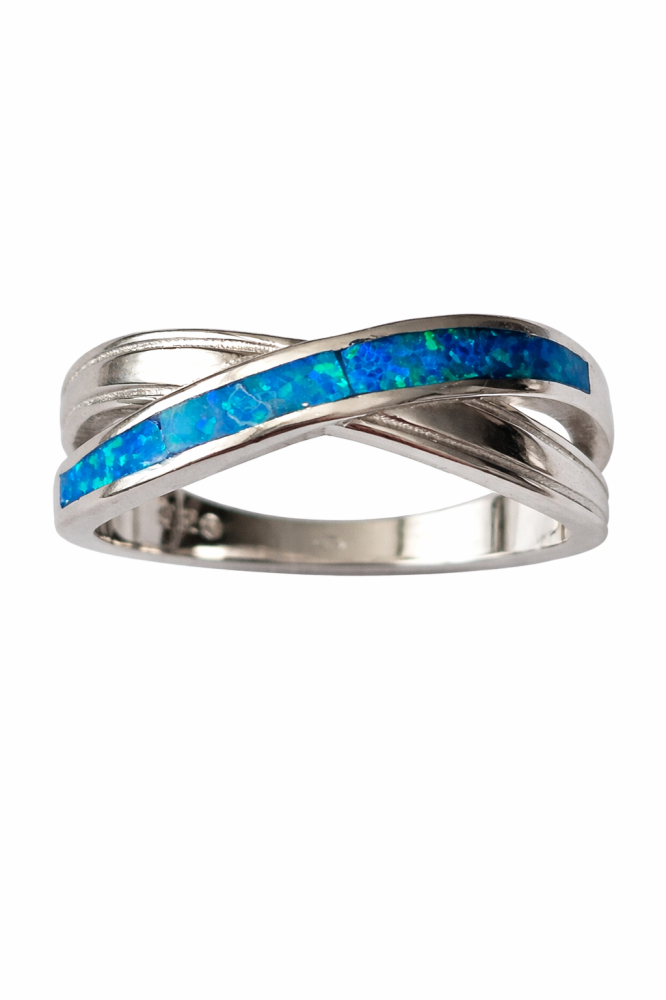 Objevte kouzlo hlubokých oceánských tónů v jedinečném prstenu ze stříbra ryzosti 925/1000. Elegantně propletený design symbolizuje spojení, nekonečno a rovnováhu. Dominantním prvkem je zářivý modrý opál, který při každém dopadu světla odhaluje fascinující hru odstínů modré, tyrkysové a smaragdové.
