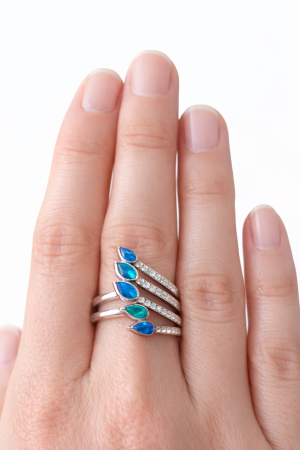 Tento prsten je oslavou světla, jemnosti a vnitřní síly ženy. Hluboké modrozelené odlesky opálů připomínají tančící polární záři na noční obloze – magickou, tajemnou a naprosto podmanivou. Každý pohyb ruky rozehraje hru barev, která nikdy není stejná.