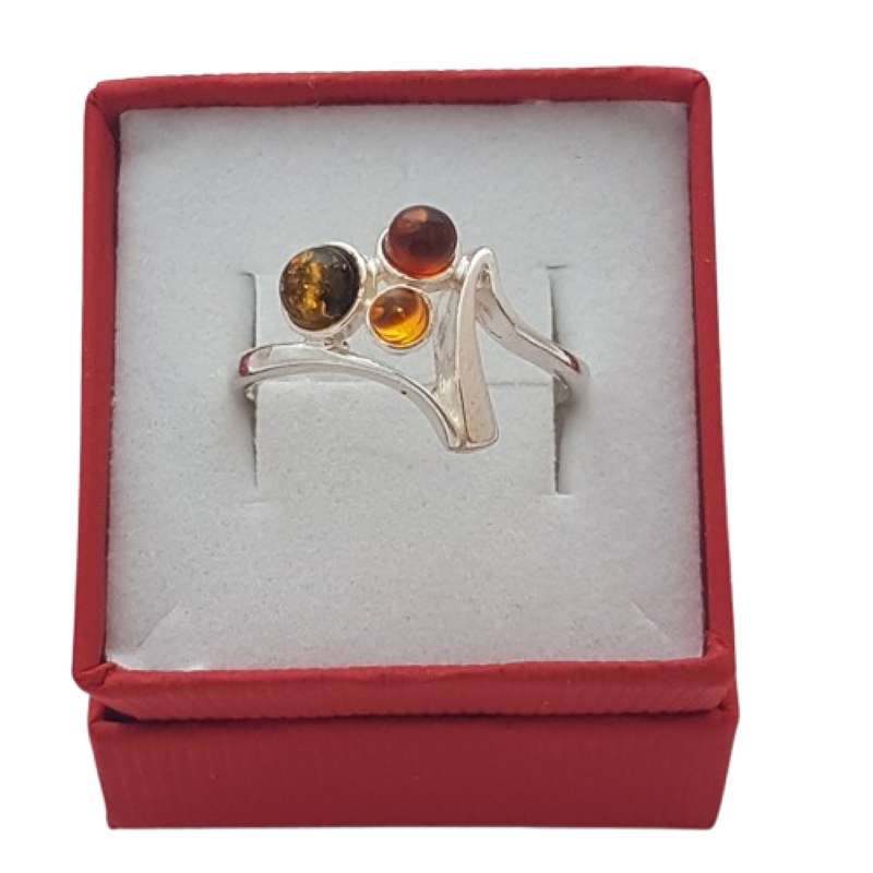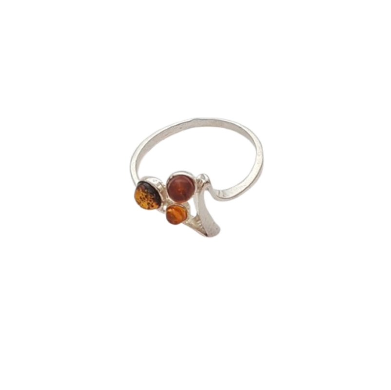 Tento stříbrný prsten s tříbarevným jantarem zaujme harmonickým spojením jemného designu a výrazné symboliky. Precizně zpracované stříbro ryzosti 925/1000 vytváří plynulé, otevřené linie, které elegantně obepínají tři jantarové kameny v různých přírodních odstínech.