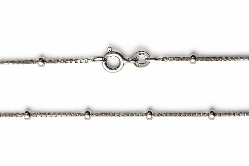 Řetízek je vyroben ze stříbra ryzosti 925/1000 a tvořen tenkým, precizně zpracovaným řetízkem, který je v pravidelných rozestupech doplněn drobnými hladkými kuličkami. Ty jemně odrážejí světlo a dodávají šperku strukturu, která působí nenápadně a přirozeně.