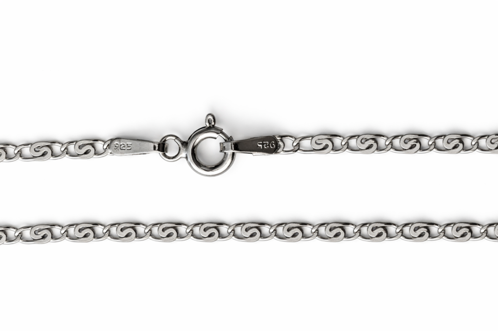 Je vyroben ze stříbra ryzosti 925/1000 a tvořen pravidelnými články s jemným ornamentálním detailem. Povrch je hladký a leštěný, díky čemuž řetízek krásně odráží světlo a působí čistě a upraveně při každém pohybu.