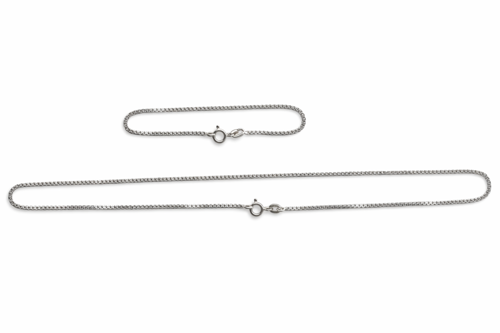 Stříbrný set s hranatým vzorem se skládá z náramku délky 18 cm a řetízku délky 45 cm. Šířka: 1.5 mm Hmotnost náramku: 18cm/1.7g Hmotnost řetízku: 45cm/3.8g