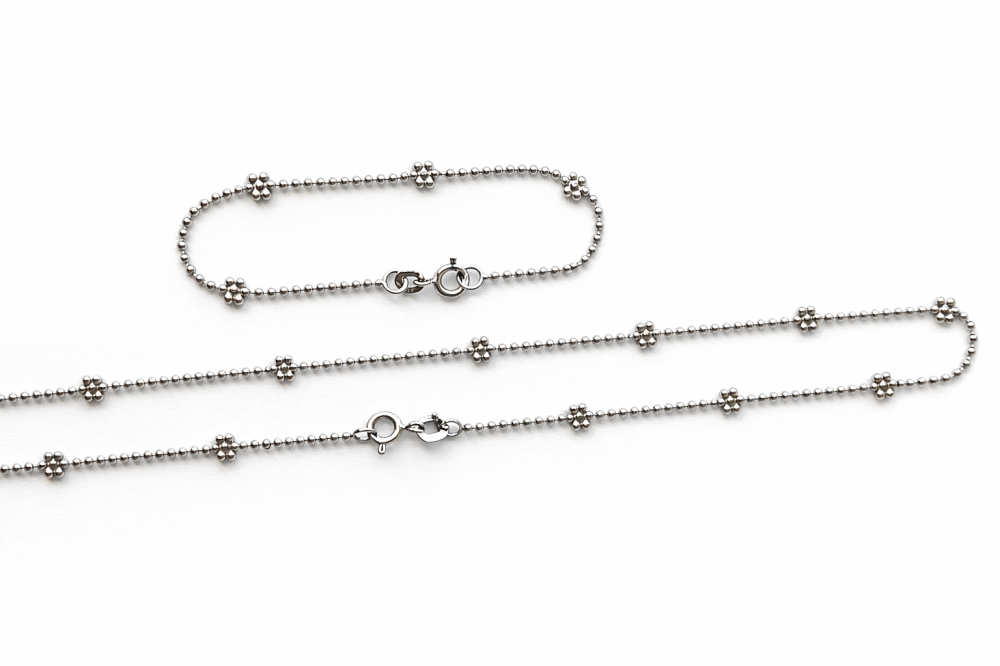 Tento stříbrný set náramku a řetízku je oslavou jemnosti, čistého designu a precizního zpracování. Oba šperky jsou vyrobeny ze stříbra ryzosti 925/1000 a propojeny subtilním motivem drobných kuliček, které dodávají setu decentní lesk a elegantní rytmus.