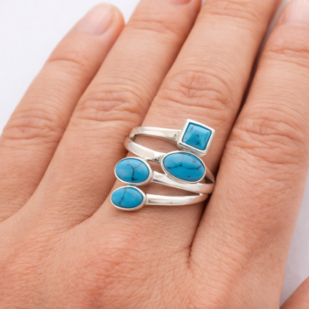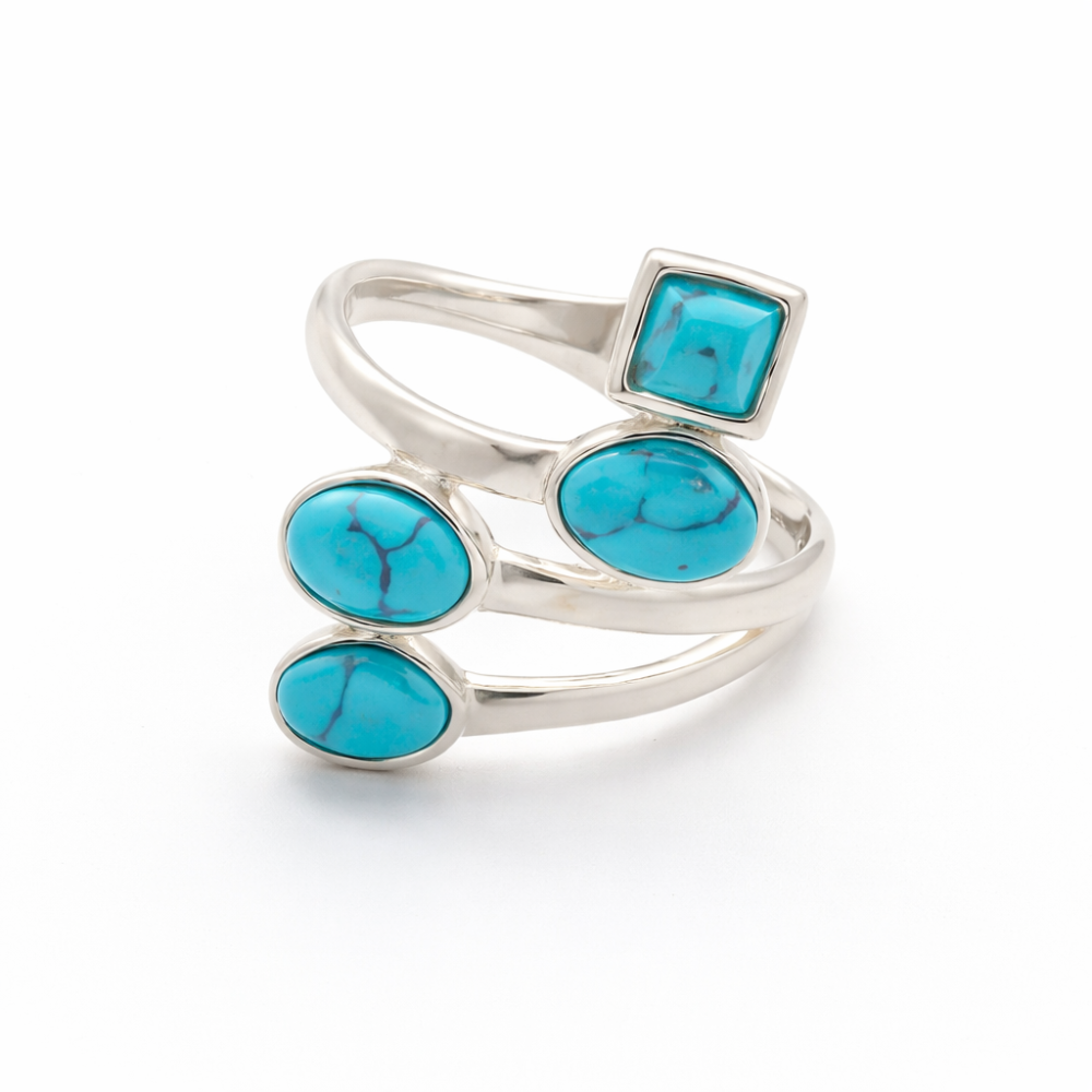 Tento stříbrný prsten s tyrkysem vyniká lehkým, dynamickým designem, který působí přirozeně a elegantně zároveň. Několik tyrkysů různých tvarů je rozmístěno tak, aby vytvářely harmonický celek s pocitem pohybu a volnosti.