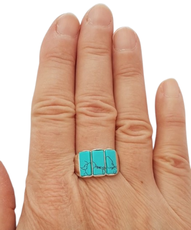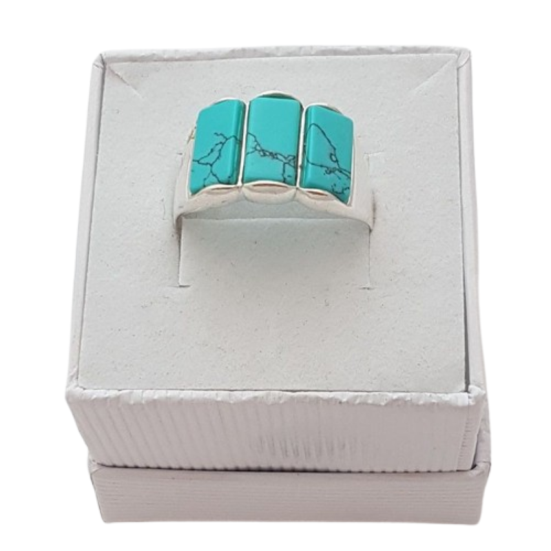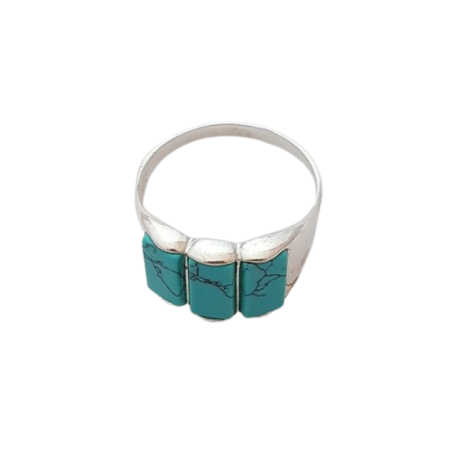 Tento stříbrný prsten s tyrkysem spojuje výrazný design s nadčasovou elegancí. Tři obdélníkové tyrkysy jsou zasazeny vedle sebe a vytvářejí harmonický celek, který působí moderně, ale zároveň zůstává přirozený a jemný.